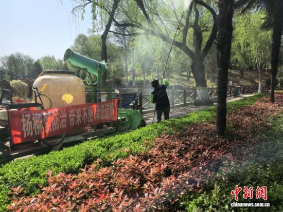 圖為河南漯河綠化工人對(duì)楊柳樹噴淋抑制飛絮。宋陟睿 攝
