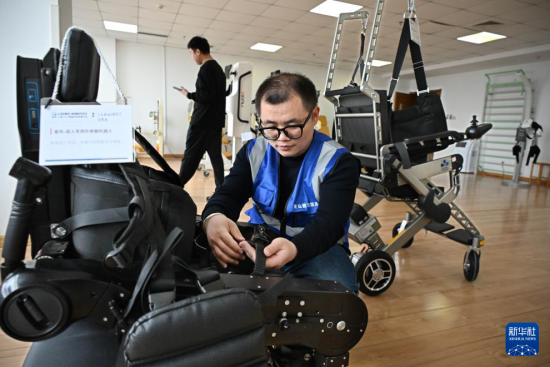 4月9日,在青島市康養(yǎng)領(lǐng)域具身機(jī)器人暨智能康復(fù)類產(chǎn)品訓(xùn)練驗(yàn)證中心,工作人員準(zhǔn)備對(duì)一臺(tái)成人專用外骨骼機(jī)器人進(jìn)行測(cè)試。新華社記者 李紫恒 攝