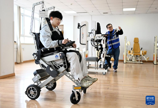 4月9日,在青島市康養(yǎng)領(lǐng)域具身機(jī)器人暨智能康復(fù)類產(chǎn)品訓(xùn)練驗(yàn)證中心,工作人員在演示下肢康復(fù)機(jī)器人功能。新華社記者 李紫恒 攝