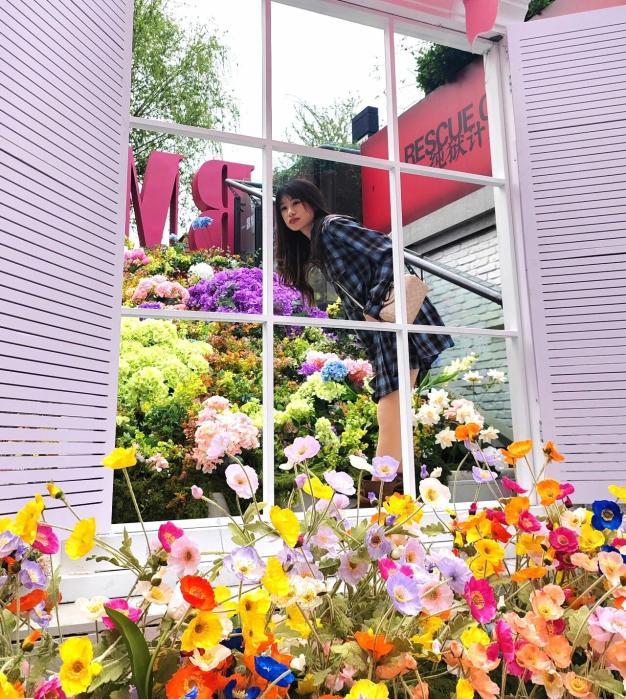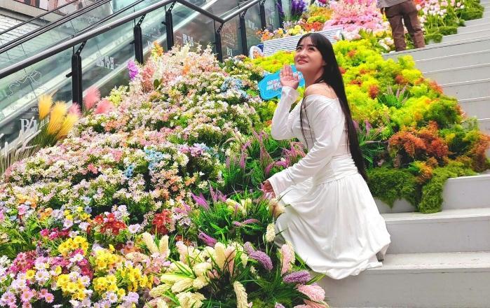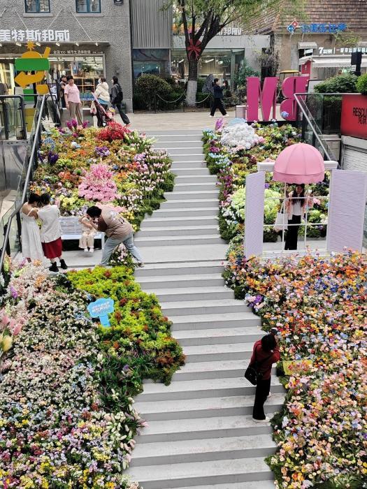 階梯之上,粉、黃、紫、紅諸色花卉層疊鋪展,高低錯落,恰似印象派大師筆下的油畫秘境。