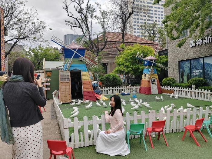 白鴿廣場上,彩風車下白羽翩躚,游人靜坐其間,定格下治愈的瞬間。
