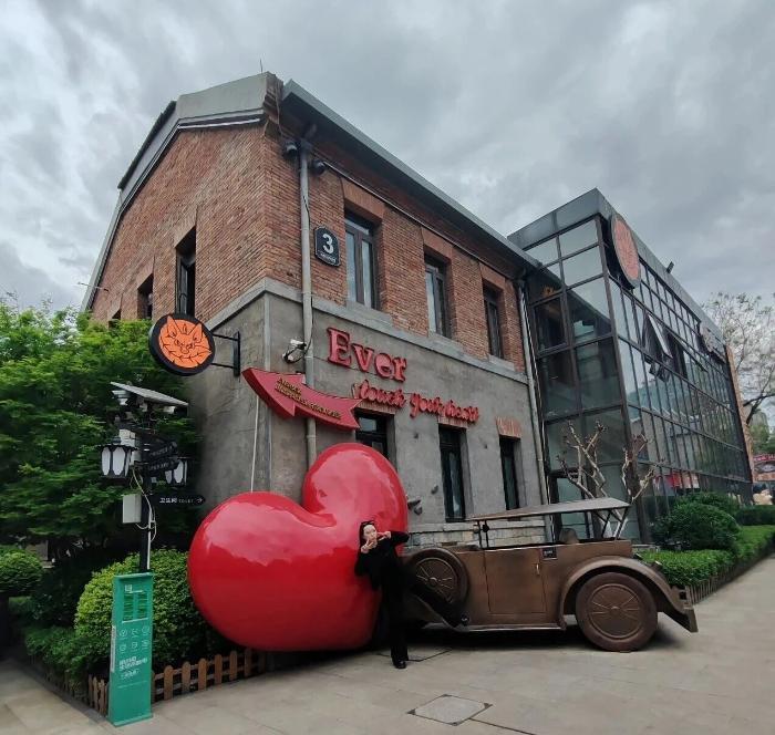 巨型紅心與復古汽車前,是年輕人定格浪漫的身影。