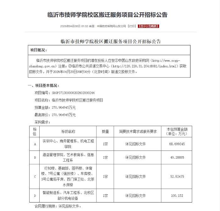 4月7日,山東省政府采購信息公開平臺發(fā)布臨沂市技師學院校區(qū)搬遷服務項目公開招標公告。公告顯示,該項目預算金額為270.964945萬元,最高限價為270.964945萬元