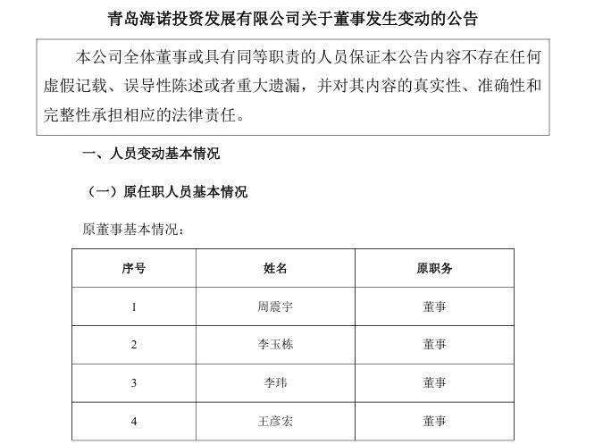 近日,青島海諾投資發(fā)展有限公司(下稱“海諾投資”)發(fā)布《關(guān)于董事發(fā)生變動(dòng)的公告》,披露公司董事會(huì)完成新一輪調(diào)整。