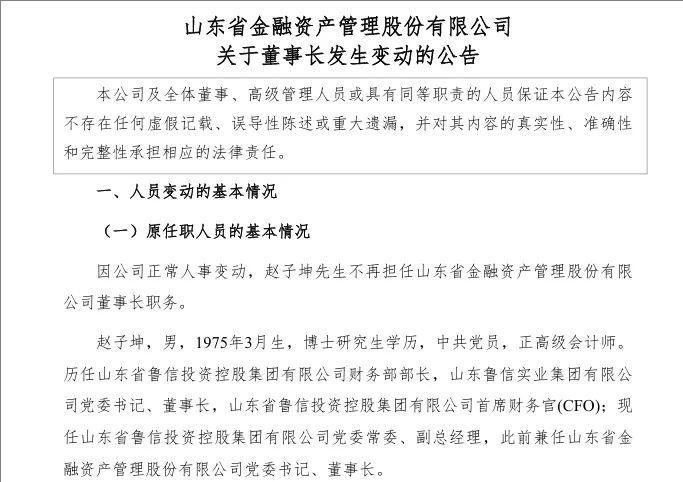 近日,山東省金融資產(chǎn)管理股份有限公司(簡稱“山東金融資產(chǎn)”)發(fā)布《關于董事長發(fā)生變動的公告》,因公司正常人事變動,趙子坤不再擔任山東金融資產(chǎn)董事長職務,選舉岳增光擔任該公司董事長職務。