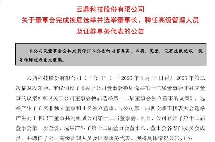 近日,云鼎科技股份有限公司(簡稱“云鼎科技”)發(fā)布公告稱,公司召開第十二屆董事會第一次會議,選舉劉波為公司第十二屆董事會董事長,同時聘任其為公司總經(jīng)理,曹懷軒、周建朋為副總經(jīng)理,鄭云紅為財務總監(jiān),向瑛為董事會秘書,董曉婕為證券事務代表。