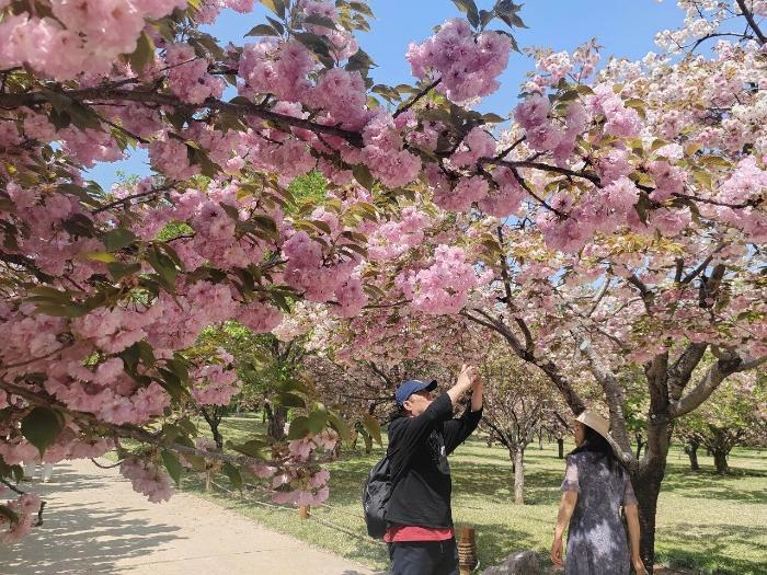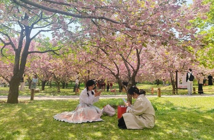 游人或駐足花間留影,或沿花徑悠然漫步,笑語與花香交織。這片遲來的繁花,成為錯過市區(qū)早櫻游客的“驚喜”,續(xù)寫著泉城春日的浪漫。
