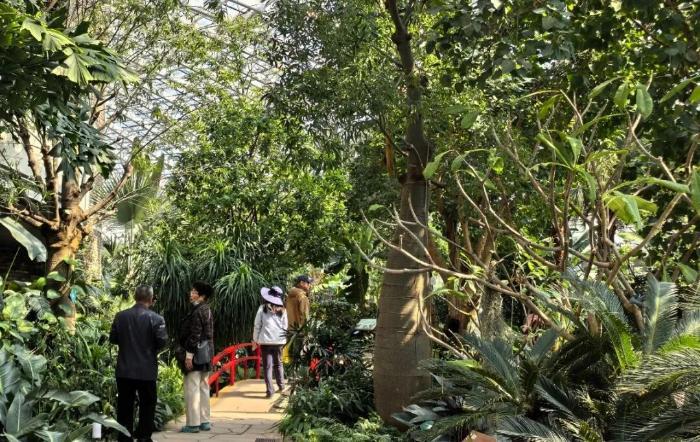 亞熱帶溫室內(nèi),霧靄繚繞,六百余種熱帶、亞熱帶植物生機盎然,小橋流水、蟲鳴鳥語,恍若把熱帶雨林搬進了濟南。