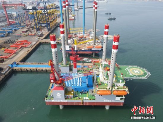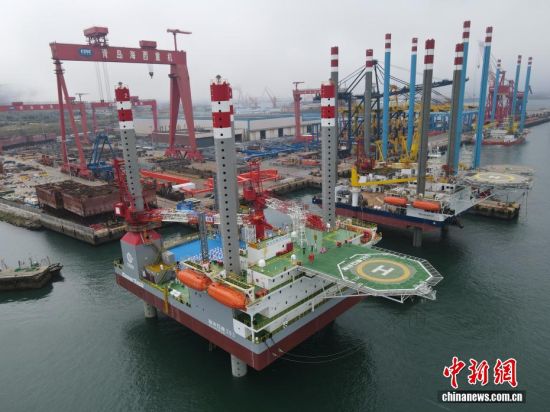 4月18日,中國(guó)自主研發(fā)建造的首座海上移動(dòng)式多功能措施平臺(tái)“增產(chǎn)一號(hào)”在山東省青島西海岸新區(qū)交付,標(biāo)志著中國(guó)在海上油田高效開發(fā)裝備領(lǐng)域取得重要突破。該平臺(tái)由中船武漢船機(jī)海西重機(jī)承建,采用“移動(dòng)式+模塊化”設(shè)計(jì)理念,改變了傳統(tǒng)固定式平臺(tái)功能單一、調(diào)動(dòng)不便的局面,投用后預(yù)計(jì)可使單井增產(chǎn)作業(yè)周期縮短40%,綜合運(yùn)營(yíng)成本降低30%。圖為該平臺(tái)等待交付。(無(wú)人機(jī)照片)楊偉 攝