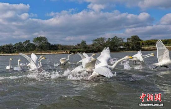 2025年10月18日,首批19只越冬大天鵝飛抵山東榮成大天鵝國(guó)家級(jí)自然保護(hù)區(qū)。榮成是“中國(guó)大天鵝之鄉(xiāng)”,每年入冬前,成千上萬(wàn)只大天鵝從西伯利亞等地來(lái)此越冬。(無(wú)人機(jī)照片) 李信君 攝