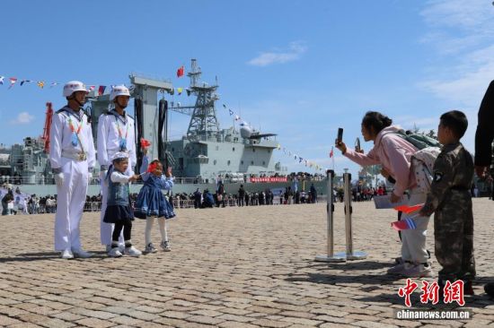 4月22日,人民海軍成立77周年北部戰(zhàn)區(qū)海軍艦艇開放活動在山東青島拉開序幕,吸引大量民眾登艦參觀。4月23日是人民海軍成立77周年紀(jì)念日,海軍于23日前后在中國十多個城市舉行軍營開放活動,四十多艘現(xiàn)役艦艇將與公眾見面。本次活動,北部戰(zhàn)區(qū)海軍在青島的兩個碼頭開放6艘艦艇,將持續(xù)至4月26日。圖為家長在艦艇甲板為小朋友拍照。張孝鵬 攝