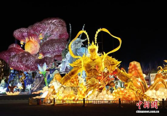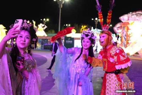 4月23日晚,在淄博花燈齊彩城,NPC扮演孫悟空,與游客合影互動。該景區(qū)擁有大型花燈88組,融入NPC互動、非遺打鐵花等演藝項目,配套文創(chuàng)市集消費場景,打造沉浸式文旅體驗。當(dāng)晚,2026年山東省文旅產(chǎn)業(yè)高質(zhì)量發(fā)展大會開幕,邀請與會嘉賓觀摩考察重點文旅項目。趙曉 攝
