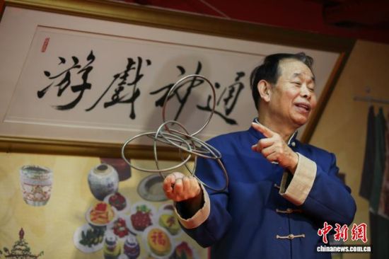 天津市雜技團戲法演員肖桂森在自己的工作室展示傳統(tǒng)中國古彩戲法“六連環(huán)”。中新社記者 佟郁 攝