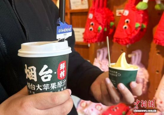 4月24日,游客在山東煙臺(tái)朝陽(yáng)街購(gòu)買(mǎi)蘋(píng)果汁和蘋(píng)果冰淇淋。王嬌妮 攝