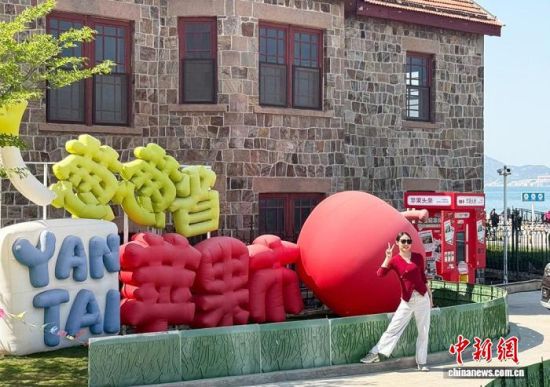4月24日,游客在山東煙臺(tái)海濱“蘋(píng)果市”主題景點(diǎn)前拍照留念。王嬌妮 攝