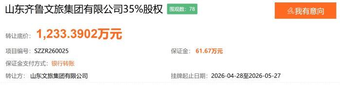近日,山東文旅集團(tuán)有限公司在山東產(chǎn)權(quán)交易中心,掛牌轉(zhuǎn)讓山東齊魯文旅集團(tuán)有限公司35%股權(quán),轉(zhuǎn)讓底價(jià)1,233.3902萬元,掛牌起止日期為2026年4月28日至2026年5月27日。