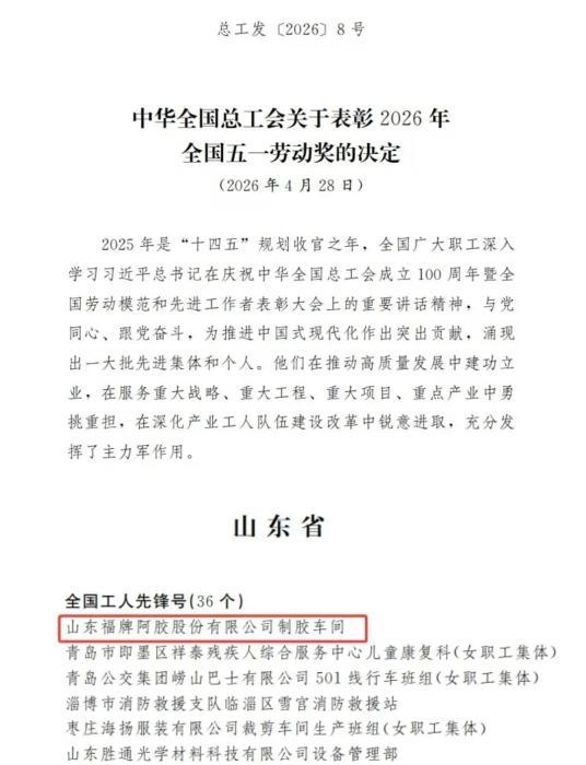 中新網(wǎng)山東新聞4月29日電 4月28日,中華全國(guó)總工會(huì)發(fā)布全國(guó)五一勞動(dòng)獎(jiǎng)表彰決定,山東福牌阿膠股份有限公司制膠車間榮獲“全國(guó)工人先鋒號(hào)”稱號(hào)。這一國(guó)家級(jí)榮譽(yù),是對(duì)這支扎根一線、堅(jiān)守匠心、勇于創(chuàng)新、無(wú)私奉獻(xiàn)的產(chǎn)業(yè)工人隊(duì)伍的最高褒獎(jiǎng),更是福牌阿膠七十余載深耕中醫(yī)藥產(chǎn)業(yè)、推動(dòng)非遺傳承和創(chuàng)新發(fā)展的生動(dòng)縮影。
