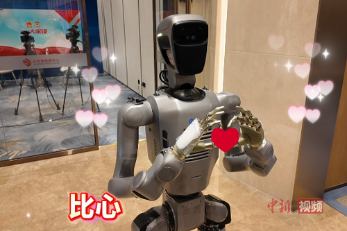 山東省政協(xié)十三屆四次會議于1月26日至30日在濟南舉行,會期4天半。記者在會議現(xiàn)場與機器人互動。(記者 王峰 趙曉 制作 劉宇)