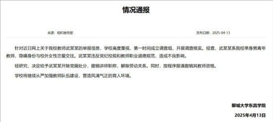 聊城大學(xué)東昌學(xué)院通報(bào):?jiǎn)紊砟星嗄杲處熚淠衬畴[瞞身份與校外女性戀愛