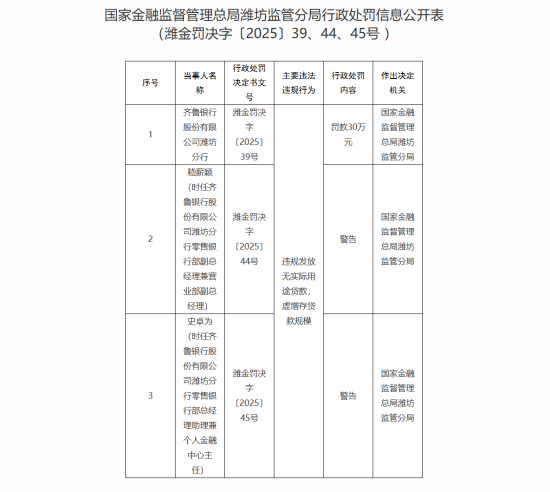 齊魯銀行濰坊分行被罰30萬(wàn)元:違規(guī)發(fā)放無(wú)實(shí)際用途貸款 虛增存貸款規(guī)模