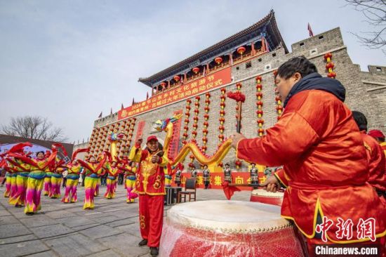 臺(tái)兒莊古城舉行社火民俗匯演藝?钻J 攝