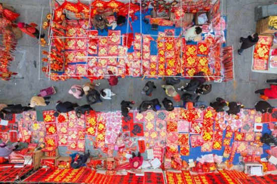 1月11日,人們在山東省青島市李村大集選購新年飾品。(無人機(jī)照片)張鷹 攝