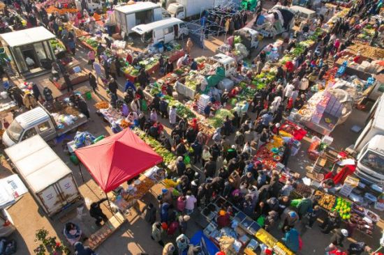 1月11日,人們在山東省青島市李村大集采購年貨。(無人機(jī)照片)張鷹 攝
