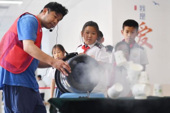 5月28日,科技志愿者在指導學生體驗“空氣炮”。王海濱 攝