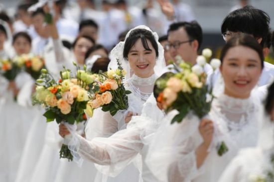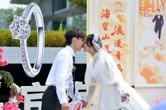 中共青島市委宣傳部、中共市北區(qū)委宣傳部等部門(mén)日前在青島濱海國(guó)際中心文明實(shí)踐廣場(chǎng),為來(lái)自教育、金融、科技等不同行業(yè)的28對(duì)新人舉行新時(shí)代集體婚禮。新人們?cè)谟H友的見(jiàn)證下交換信物、簽訂婚書(shū),完成一場(chǎng)簡(jiǎn)約而時(shí)尚的集體婚禮。