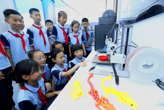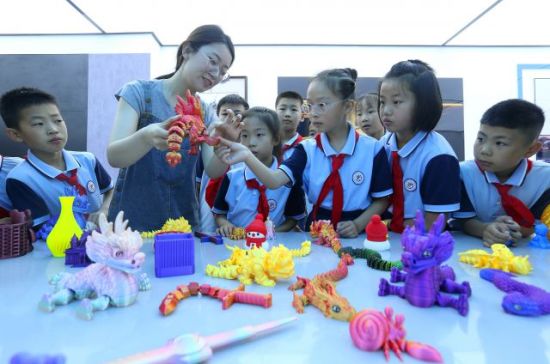 6月19日,山東省青島市即墨區(qū)靈山牛齊埠小學的學生在體驗3D打印文創(chuàng)產(chǎn)品。梁孝鵬 攝