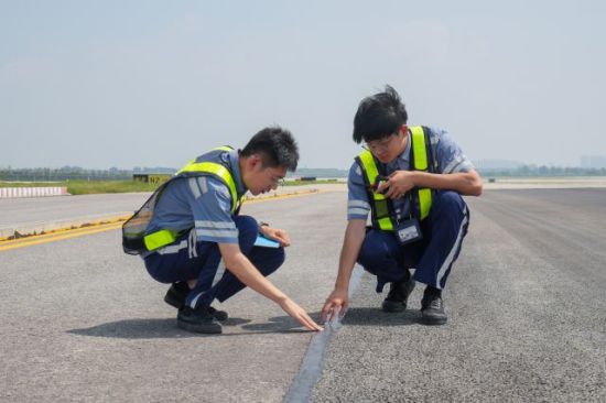 場(chǎng)區(qū)管理員進(jìn)行巡視滑行道道面。(青島機(jī)場(chǎng)供圖)