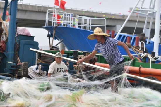 8月28日,在山東省青島市城陽(yáng)區(qū)河套街道漁港碼頭,漁民在整理網(wǎng)具上船。王海濱 攝
