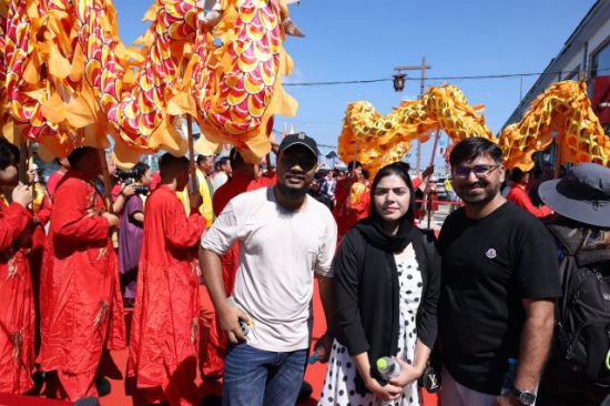 外國友人在開海儀式的舞龍環(huán)節(jié)合影留念。謝順偉 攝