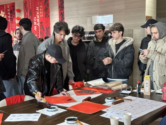 迎新年,品非遺,F(xiàn)場,包餃子、剪紙、制作螺鈿等特色非遺體驗區(qū)前圍滿了外籍留學(xué)生,大家踴躍體驗著不同的非遺活動。剪紙體驗區(qū),留學(xué)生們手拿一把剪刀,一張紅紙,手指翻飛間,“福”“囍”等代表著吉祥寓意的圖樣躍然紙上;書法體驗區(qū),大家執(zhí)筆揮毫?xí)鴮懼鴮ξ磥淼摹案!痹福惺苤袊P墨的獨特神韻;茶藝體驗區(qū),大家則體驗了中國傳統(tǒng)茶藝,于一呼一吸間感悟東方哲學(xué)的寧靜與雅致。