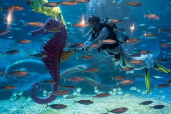 今年春節(jié),青島極地海洋公園首創(chuàng)的“水下賽馬”和賀歲“水下舞獅”表演成為最大亮點(diǎn)。為將陸上節(jié)慶活動(dòng)巧妙移植水下,保育員團(tuán)隊(duì)自一月初便投入訓(xùn)練,努力克服水下阻力,操控8公斤重的獅頭完成舉獅、擺頭等水下高難度動(dòng)作,并操控1.5米高的海馬道具進(jìn)行水下趣味競(jìng)技表演。演出時(shí),“獅子”與“海馬”在魚群環(huán)繞間穿梭,呈現(xiàn)出一場(chǎng)趣味十足的水下新春大秀,寓意新的一年“如魚得水、馬到成功”,吸引眾多游客駐足拍攝。帶著孩子觀演的游客張女士興奮地表示:“從來沒想過能在水下看‘賽馬’和舞獅,特別新奇,孩子看得眼睛都不眨,年味十足!”