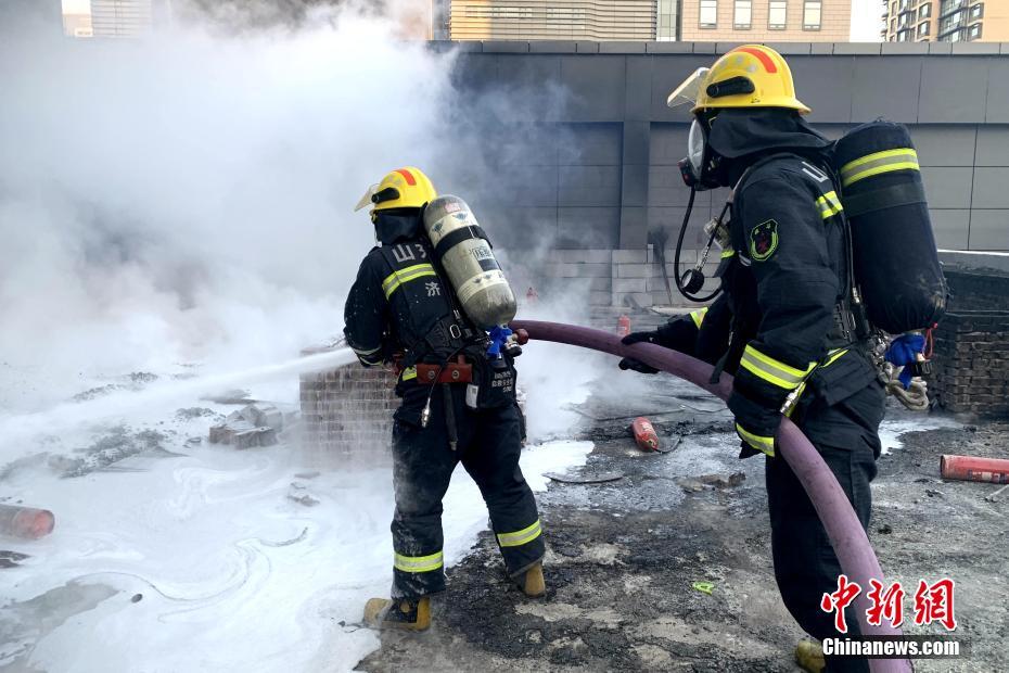 1月6日,位于山東省濟(jì)南市歷下總部商務(wù)中心工地突發(fā)火災(zāi),現(xiàn)場濃煙滾滾。濟(jì)南市消防救援支隊接警后,指揮中心立即調(diào)派消防員趕赴現(xiàn)場處置。8時01分,消防救援人員到達(dá)現(xiàn)場,8時10分,明火被撲滅,消防救援人員正在清理現(xiàn)場。圖為消防員在火災(zāi)現(xiàn)場進(jìn)行撲救。 中新社發(fā) 丁昊 攝