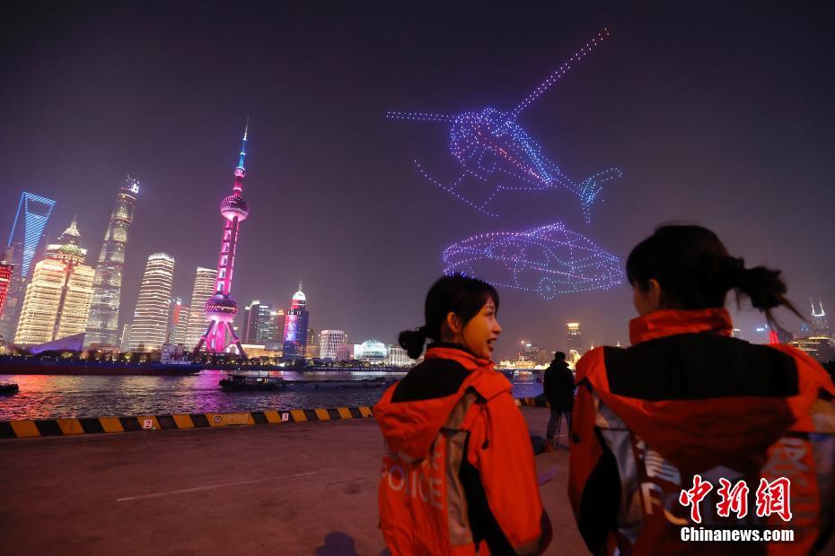 1月10日晚,1100架無人機(jī)從上海北外灘虹口濱江起飛,在空中組成多種圖案,向在首個中國人民警察節(jié)節(jié)日中堅守崗位的人民警察致以崇高敬意。中新社記者 殷立勤 攝