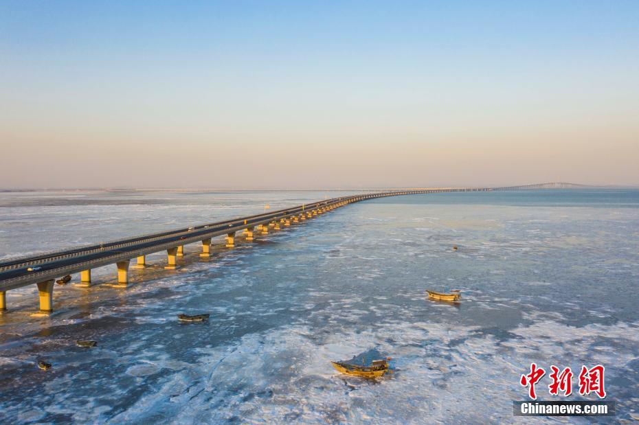 2021年1月8日傍晚,山東青島膠州灣大橋橋墩孔洞的柱壁上,呈現(xiàn)出綺麗無比的“金光穿橋洞”景觀。中新社發(fā) 韓加君 攝 圖片來源:cnsphoto