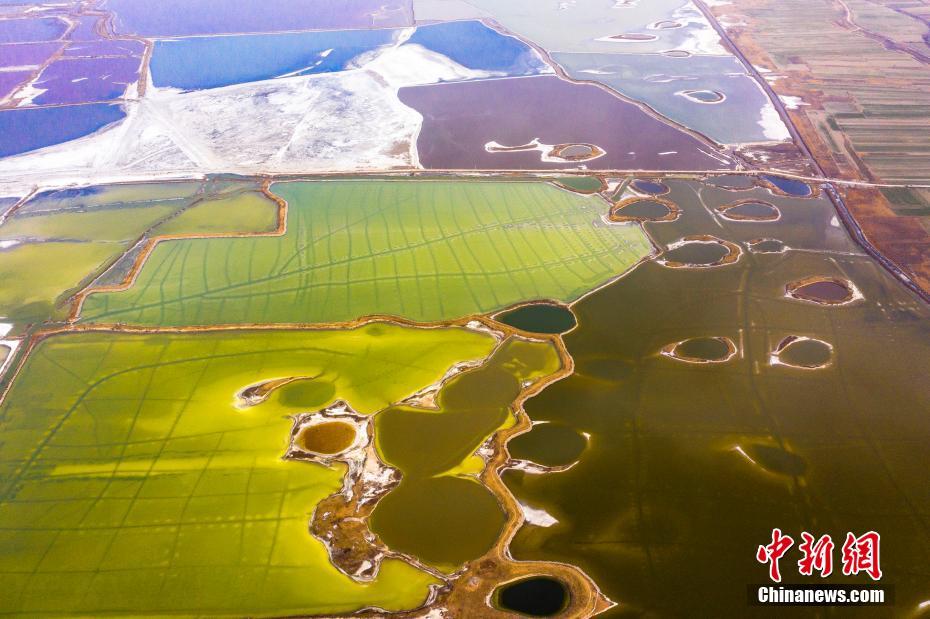 2021年1月15日,山西省運城市鹽湖冬季風光。從空中俯瞰,多彩鹽湖猶如調(diào)色盤,成為冬日運城一道特有的風景。中新社發(fā) 史港澤 攝 圖片來源:cnsphoto
