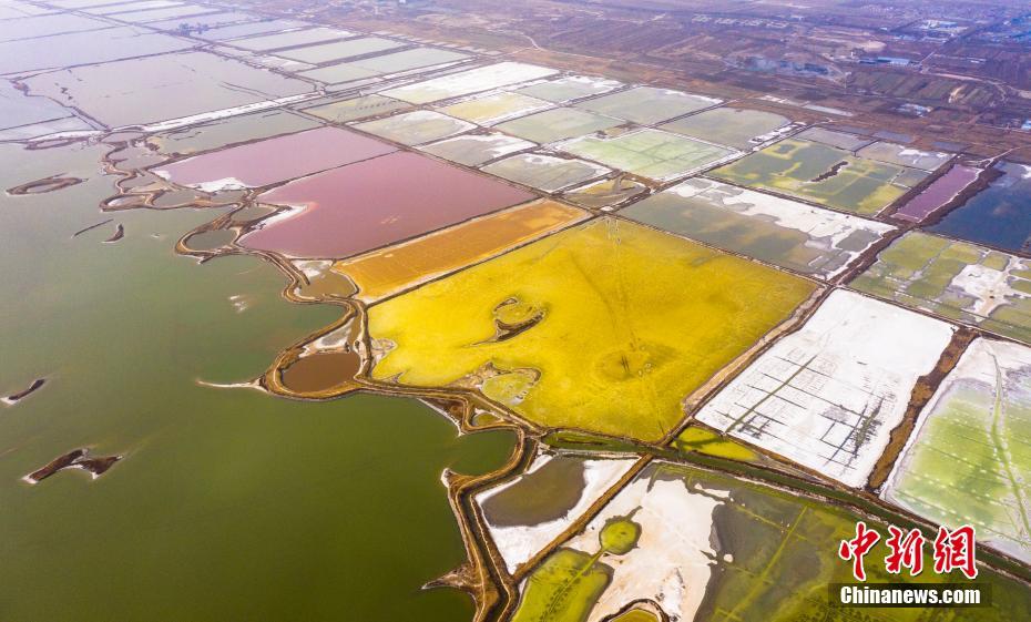 2021年1月15日,山西省運城市鹽湖冬季風光。從空中俯瞰,多彩鹽湖猶如調(diào)色盤,成為冬日運城一道特有的風景。中新社發(fā) 史港澤 攝 圖片來源:cnsphoto