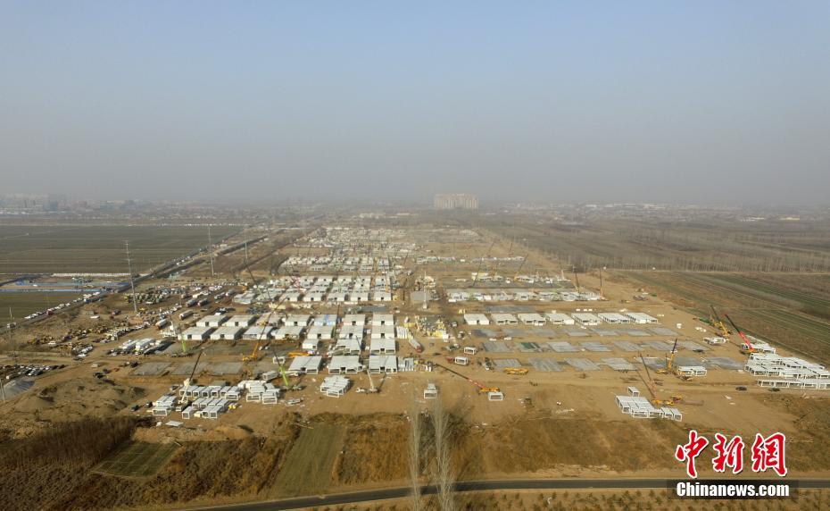 1月16日,石家莊黃莊公寓隔離點項目工地上,工人們正在加緊進行施工作業(yè)。日前,石家莊市開始建設(shè)用于安置新冠肺炎密切接觸者和次密切接觸者等人員的集中隔離點。據(jù)了解,黃莊公寓隔離點項目于1月13日開工,選址在正定縣與藁城區(qū)交界處,占地面積510畝,總建筑面積6.9萬平方米。圖為航拍黃莊公寓隔離點施工現(xiàn)場。中新社記者 諶詩雨 攝