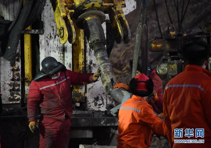 1月17日,救援人員在進(jìn)行下套管作業(yè),準(zhǔn)備與被困人員取得聯(lián)系。新華社記者 王凱 攝