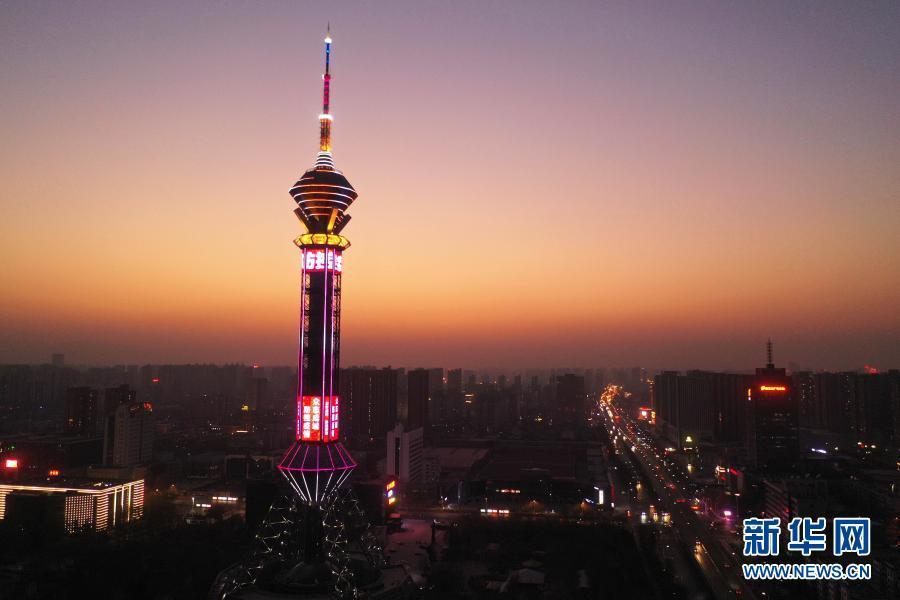 1月18日拍攝的石家莊電視塔(無人機照片)。近日,河北石家莊電視塔大屏幕上打出“石家莊加油”“眾志成城 防控疫情”等標語,為抗疫加油。新華社記者 邢廣利 攝 圖片來源:新華網(wǎng)