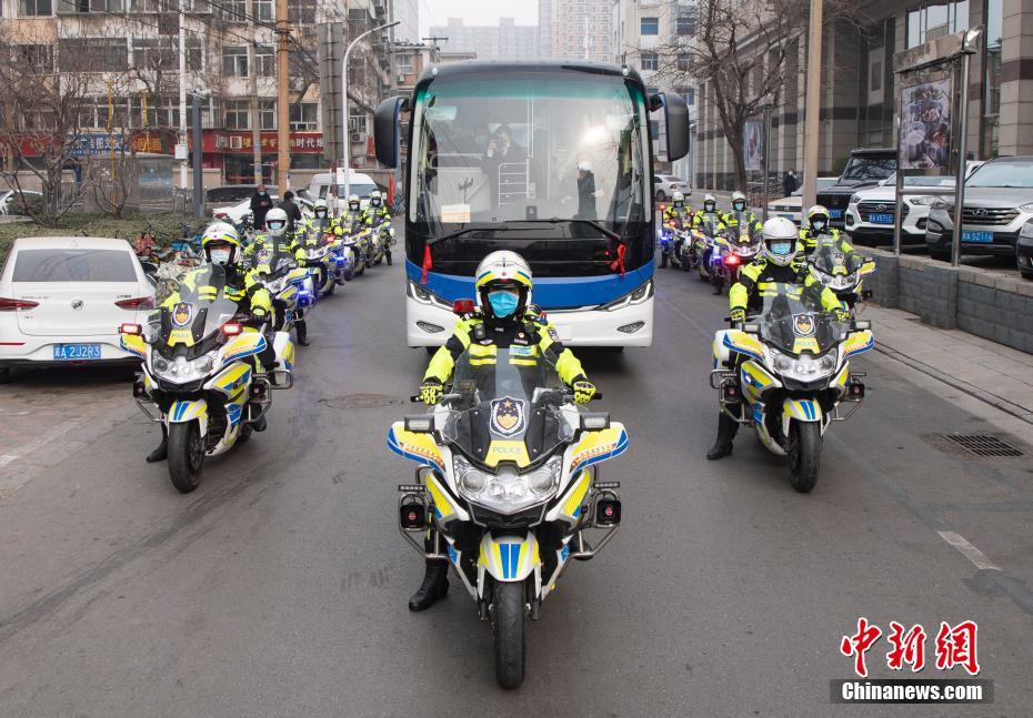 1月27日,陜西省援冀醫(yī)療隊結束任務,離開位于河北省石家莊市的住地,踏上返程。圖為醫(yī)療隊大巴車享受石家莊交警的護送禮遇。中新社記者 侯宇 攝