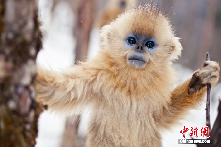 在新一輪冷空氣影響下,湖北西部高海拔地區(qū)日前迎來雨雪天氣。在神農(nóng)架國家公園,成群的金絲猴下山,來到低海拔的雪林中覓食嬉戲。它們金發(fā)、藍臉、大眼、翹鼻,萌態(tài)十足惹人愛。神農(nóng)架金絲猴屬川金絲猴,是我國特有的珍稀瀕危物種。圖為金絲猴萌態(tài)十足。 薛揚 攝