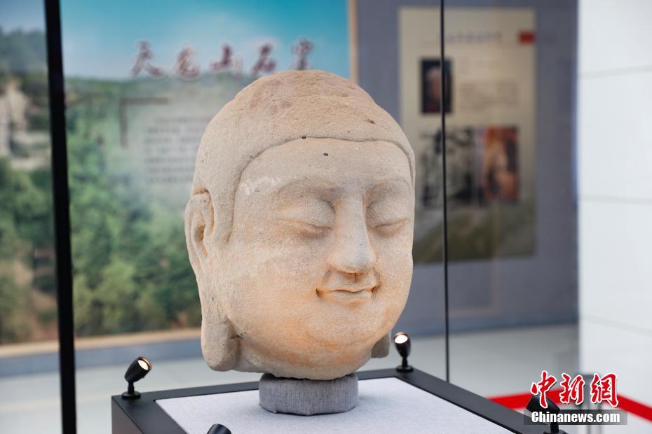 2月12日,“咸同斯福——天龍山石窟國寶回歸暨數(shù)字復(fù)原特展”在北京魯迅博物館開展。圖為天龍山石窟第8窟北壁主尊佛首(隋代)。此尊被盜佛首于1924年前后被盜鑿并非法盜運出境,2020年10月31日,由日籍華僑張榮無償捐獻給中國國家文物局,12月12日12時,佛首安全運抵北京,重回祖國懷抱。 中新社記者 杜洋 攝