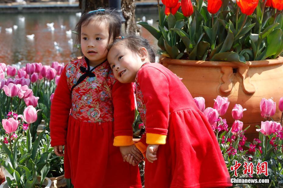 2月16日,云南昆明,小朋友在郁金香前合影。近日,昆明大觀公園內(nèi)27個(gè)品種、5大色系的15萬株郁金香競(jìng)相綻放,吸引民眾觀賞。 中新社記者 李嘉嫻 攝