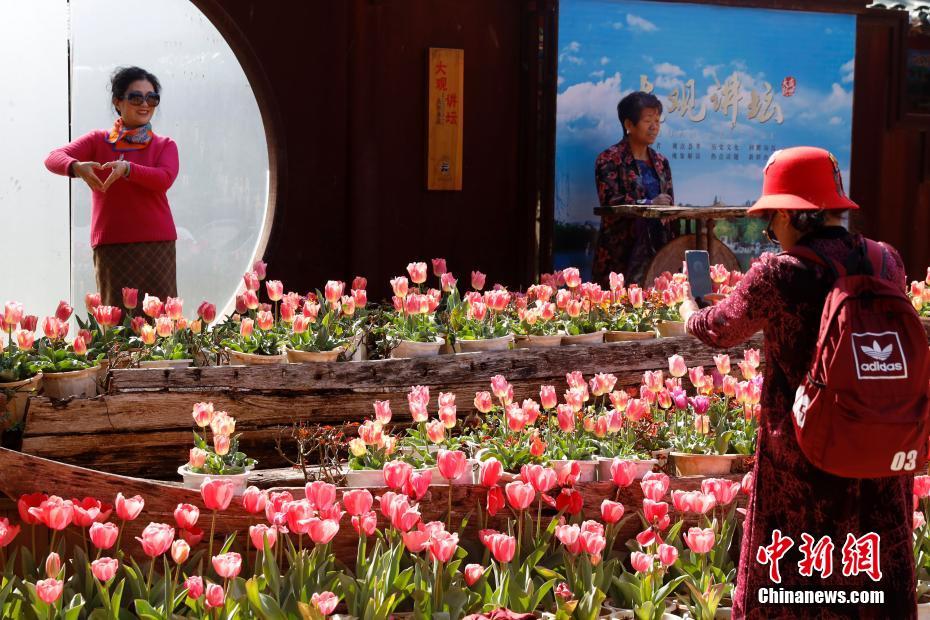 2月16日,云南昆明,市民與郁金香合影。近日,昆明大觀公園內27個品種、5大色系的15萬株郁金香競相綻放,吸引民眾觀賞。 中新社記者 李嘉嫻 攝