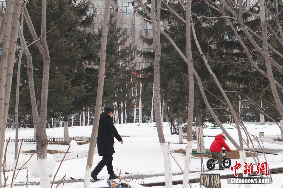 2月21日,吉林通化,市民帶孩子到戶外游玩。自20日22時(shí)起,通化市東昌區(qū)全域調(diào)整為低風(fēng)險(xiǎn)地區(qū)。至此,通化市全域均為低風(fēng)險(xiǎn)地區(qū),市民生活逐漸恢復(fù)正常。中新社記者 蒼雁 攝