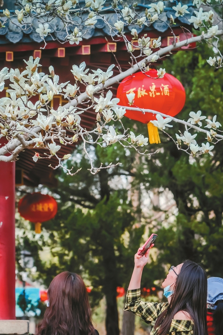 2月21日,濟(jì)南最高氣溫上升至25.6℃,趵突泉景區(qū)內(nèi),白雪樓與玉蘭院的白玉蘭競相綻放,潔白無瑕。時(shí)下是白玉蘭的最佳觀賞期,游客紛紛記錄下這美好瞬間。新時(shí)報(bào)記者黃中明